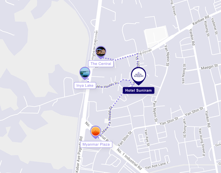 At Hotel Suniram, you will be in the heart of it all. Situated in a quiet lane just off the busy Kabar Aye Pagoda Road, our prime location in Yankin puts you just steps away from the best attractions, dining, shopping, and entertainment options the area has to offer. Let our concierge team help you plan your itinerary and make the most of your visit.